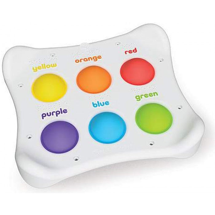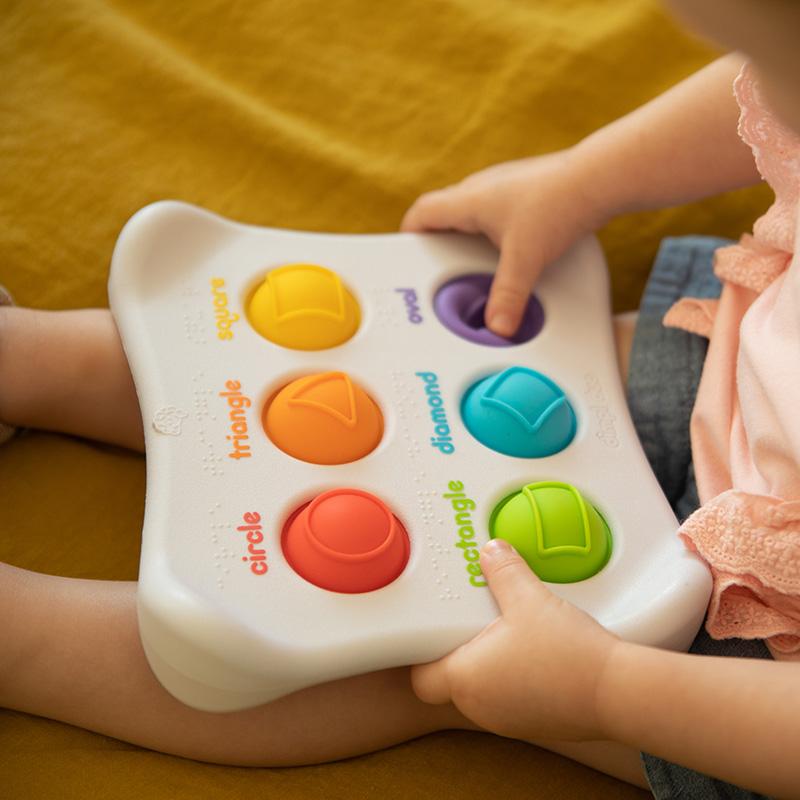 On one side, each silicone button is embossed with a different shape and labeled with its matching word in English and in Braille. Flip the whole thing over and this time, the buttons are smooth and the words match the colors!