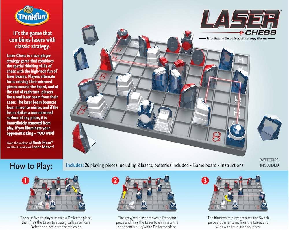 Laser Chess is an expert-level two-player strategy game blending the spatial reasoning of chess with interactive laser technology. On each turn, players maneuver mirrored pieces strategically before activating a real laser beam that reflects off mirrors. When the laser hits a non-mirrored surface, that piece is eliminated. Successfully targeting the opponent’s King secures victory. Recognized for its educational value, this game was honored as a Parent Tested Parent Approved Top Toy and received the Seriously STEM Award, making it a standout choice for developing critical thinking and problem-solving skills.
