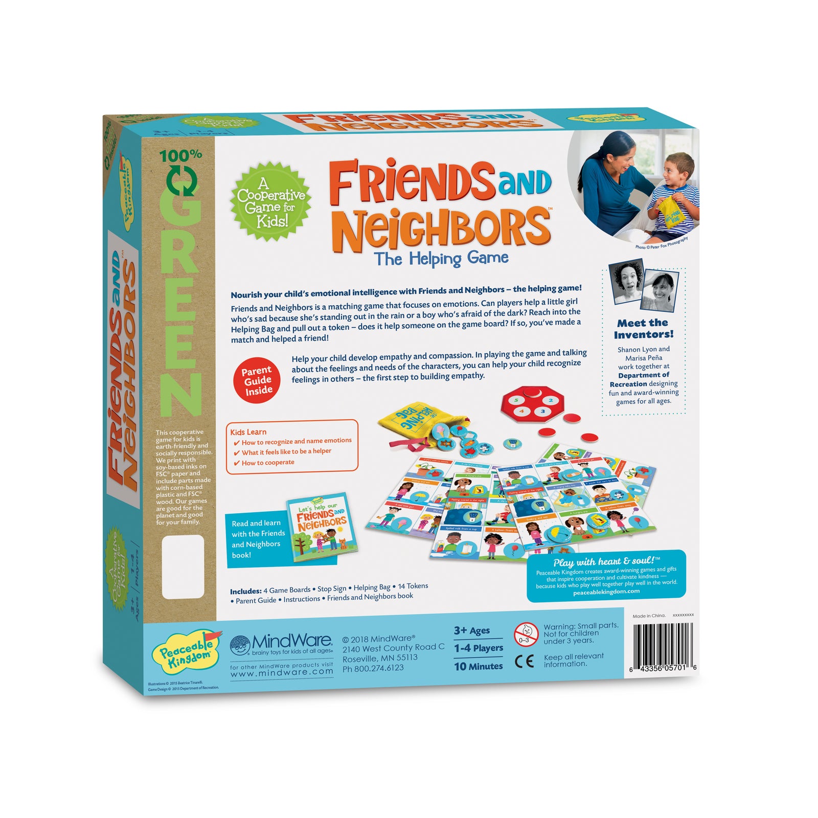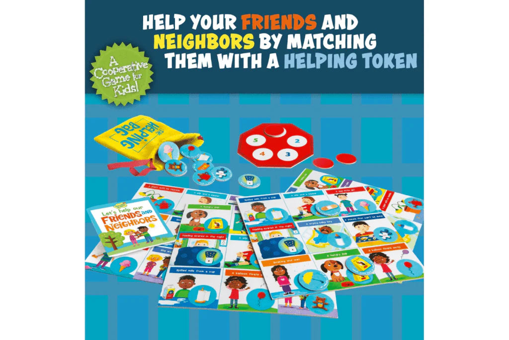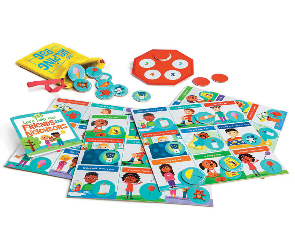 Includes: 4 game boards, 14 tokens, 1 helping bag, 1 stop sign board, social and emotional intelligence parent guide and friends and neighbors story book.